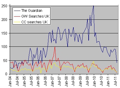 The chart above suggests that the answer is “no”, at least in the case of the British public. Or more specifically, we can find a more than passing resemblance between The Guardian’s coverage of climate change and the tale of the boy who cried wolf. The blue line in the chart provides a count of articles dealing with global warming and climate change published by The Guardian on a given month. The line in red represents the relative popularity of the term ‘global warming’ within the UK, and the yellow line represents the relative popularity of the term ‘climate change’.