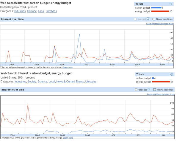 In the UK, Search volumes for “carbon”- and “energy”- “budget” behave like separate entities at first, but become more intertwined as time goes by. In the US, they remain distinctly separate. This tendency can be seen in many other comparisons of carbon/energy compounds, such as carbon/energy taxes and carbon-energy credits, not plotted here for reasons of space but easily verifiable by the reader using the tools made available by Google.