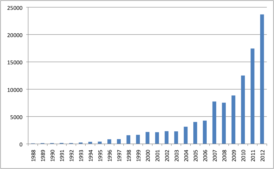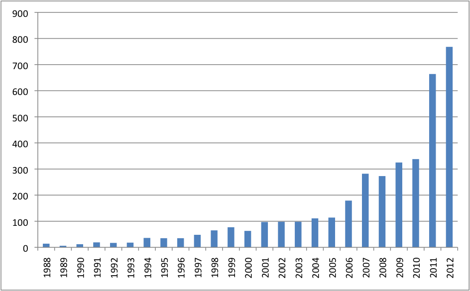 English language news reporting on ‘extreme weather’ has increased steadily since 1988 (Figure 1) when climate change became an issue of public concern and has been increasing quite substantially since 2007, the year of the IPCC report, after which, on other graphs, such as the regularly updated international media coverage graph by Max Boykoff, interest in climate change itself has, by contrast, been falling. The same is true, although with much smaller numbers, for ‘climate extremes’ (see figure 2). What many have called a ‘year of weather/climate extremes’ (2011) seems to have accelerated this trend even more, both for news on extreme weather and climate extremes, but particularly for climate extremes. This seems to indicate that associating climate with extremes may become more prevalent in the future and may (indicate a) shift (in) public opinion about climate change in general. An increase in extreme weather/climate talk might make efforts to keep extreme weather discussions separate from discussions about climate change more difficult in the future.