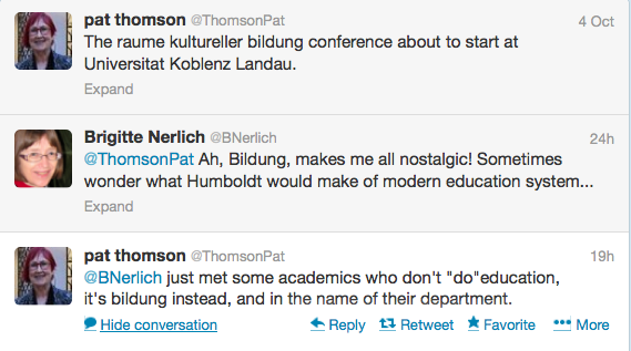 That brings me to Bildung and Humboldt, believe it or not! A few days ago Pat went to a conference at the University of Koblenz-Landau on Räume kultureller Bildung which led to the following exchange