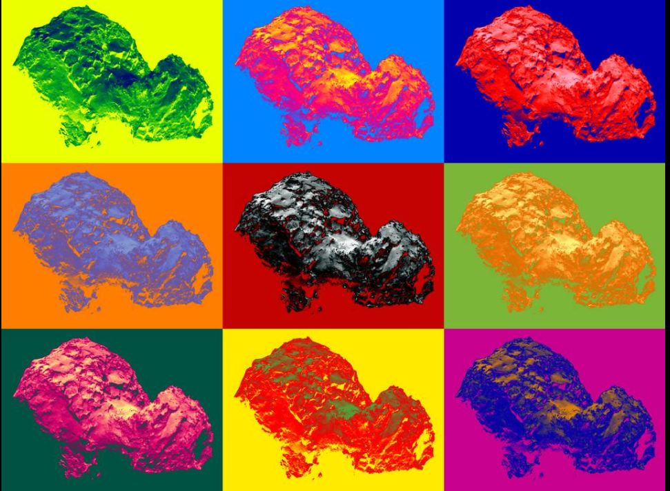 In terms of ‘alien’ life, some saw the face of a man on the comet and some saw a cat (or even Elvis)! However, the duck seems to be winning out. Alex Parker tweeted: “As predicted by the Rubber Ducky Model, 3D images clearly reveal that #Comet67P has a beak” (see here) (and as a duck). Alex also immortalised the comet, rather than Rosetta, as a Warhol inspired painting (see above!) So, together with the rubber duck epithet, Chury is beginning to steal the show from Rosetta in this celestial rendevouz and to be coming to life in our imaginations. We’ll have to wait until the end of this year in order to know whether there is more than metaphorical life on this comet!