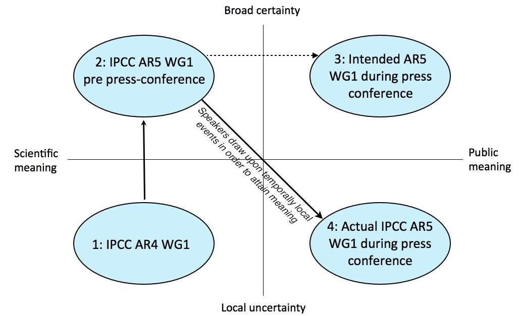 In this blog post we’ll go through what happened in the press conference by detailing four stages in the intended process of making climate change meaningful. We’ve reproduced some figures for our article here because we think they make it much easier to follow the argument. The matrix for all of these figures places ‘meaning’ on the x-axis and ‘certainty’ on the y-axis. We won’t go into details here but, if you’re interested in the creation of the matrix please look at the method section of the article itself, or leave a comment below. Line numbers refer to a transcript of the press conference which is available in the paper’s supplementary information.