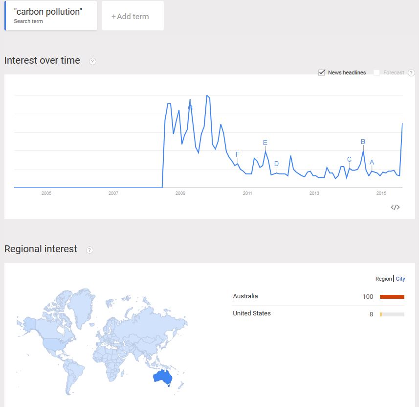 After 2010 interest in carbon pollution waned. However, as the figures show, it increased a bit in both Australia and the US over the last few days after President Obama’s announcement, but only to dissipate again quite quickly (I searched on 5 August).