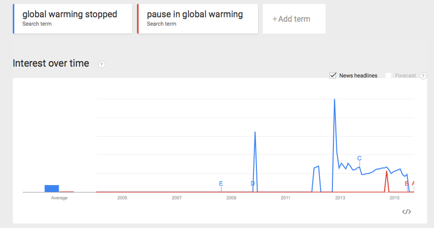It is also interesting to look at Google Trends and see how often and when people searched for ‘pause in global warming’ and ‘global warming stopped’. As you can see from the featured image above (I searched Google Trends on 26 September), there were spikes in the searches for ‘global warming stopped’ in 2009/10 and in 2012/13 which coincide with spikes of attention to the ‘pause’ in science and the media. Small spikes in searches for ‘pause in global warming’ can only be found towards 2014/15, that is, when the existence/importance of the ‘pause’ began to be more seriously discussed. There is slightly a higher search volume for ‘global warming pause’ than for for ‘pause in global warming’. Searches for ‘global warming pause’ started at the beginning of 2014 and quite a few question the existence of a ‘pause’. For more info, see Mooney’s article quoted above and this article by Lewandowsky et al. which has just appeared in the Bulletin of the American Meteorological Society). All this needs more scrutiny though, as does the rest of my ‘research’ for this post!