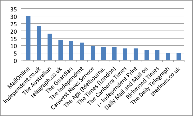 Graph of ‘Newspapers’ using the phrase ‘pause in global warming’ in ‘All English Language News’ (search carried out 25 September, 2015; I cut off a long ‘tail’ of newspapers that only mention the issue in one or two articles)