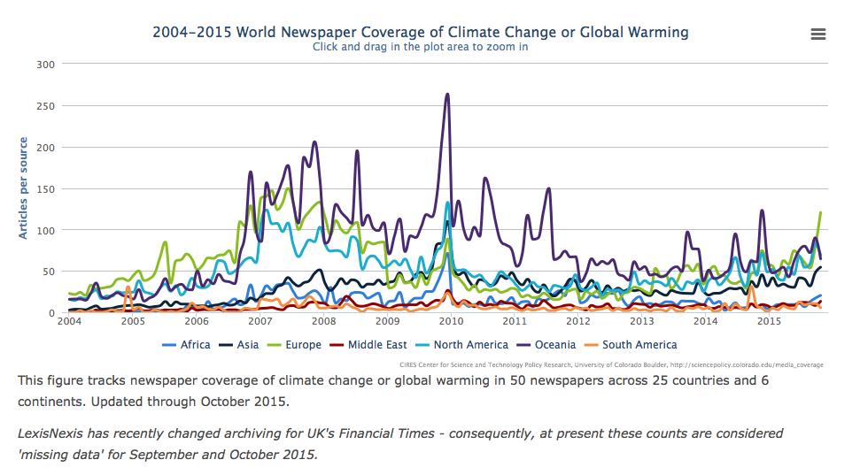 Figure citation: Daly, M., Gifford, L., Luedecke, G., McAllister, L., Nacu-Schmidt, A., Andrews, K., and Boykoff, M. (2015). World Newspaper Coverage of Climate Change or Global Warming, 2004-2015. Center for Science and Technology Policy Research, Cooperative Institute for Research in Environmental Sciences, University of Colorado, Web. [accessed 28 November, 2015] http://sciencepolicy.colorado.edu/media_coverage.