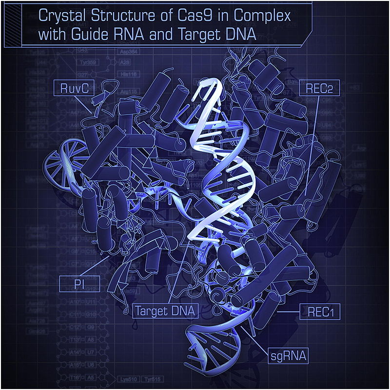 Image: Wikimedia Commons: Crystal structure of S pyogenes Cas9 in complex with sgRNA and its target DNA at 2.5 A ˚ resolution.(Nishimasu, et al. 2014)
