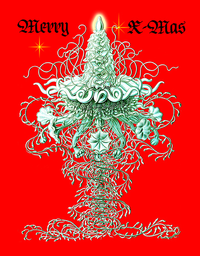 I was looking idly through my tweets this morning when my eye landed on one by Mo Costandi saying “Before his ‘Artforms in Nature’ (http://bit.ly/1GIlTwE), Ernst Haeckel designed greeting cards”. This led me to a flickr page where John Holbo had assembled some of Haeckel’s Christmas cards (but where they?), entitled ‘A Very Haeckel Christmas’. I was quite enchanted, as I have always been fascinated by Haeckel’s Kunstformen der Natur.