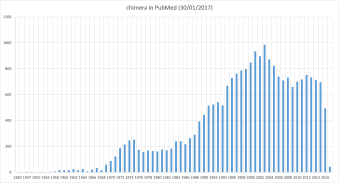 The term ‘chimera’ also has a long history, but I only want to point out that it was first used in a scientific sense (German ‘Chimäre’; graft hybrid) in 1907 by Hans Winkler in the context of plant breeding. The OED provides the following definition of this type of chimera: “An organism (commonly a plant) in which tissues of genetically different constitution co-exist as a result of grafting, mutation, or some other process.”