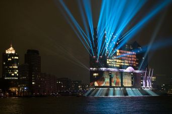 Some years ago, I went to Hamburg to participate in a climate change conference and Martin Döring, an old friend and colleague who works in Hamburg, organised a tour of the port. I remember passing a very impressive half-built building jutting out into the Elbe. This was the Elbphilharmonie, “one of the largest and most acoustically advanced concert halls in the world. It is popularly nicknamed Elphi. The new glassy construction resembles a hoisted sail, water wave or quartz crystal” (Wikipedia). The concert hall was inaugurated in January 2017. As you can see below, this event involved a bit of a light show.
