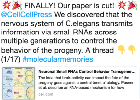 He also retweeted a ‘thread’ by the group leader, Oded Rechavi, which was a masterpiece of science communication, both verbal and visual – indeed, threading them both creatively together. We’ll come to that in a minute.