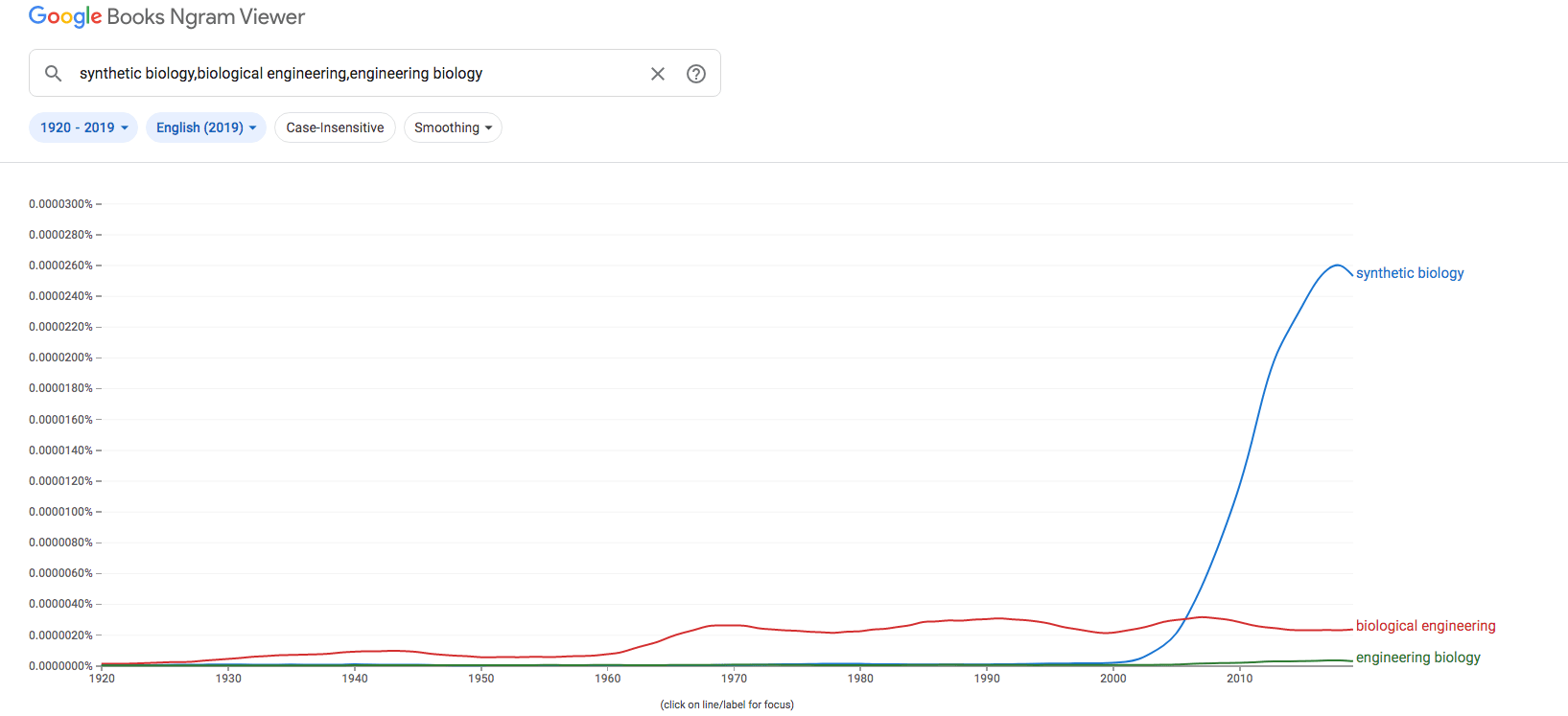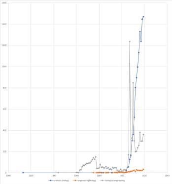 But first let’s do a bit of tracking to see whether there is a shift in the use of these terms. When I put ‘engineering biology’ into Google, I was also directed to ‘biological engineering’. So I included this in my searches.