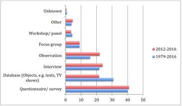 1. Most research papers have reported ‘one-off’ studies compared to only 3% having a longitudinal design (a proportion that has even declined in the past 5 years, whereas pre/post studies have increased further). Our study, therefore, discusses the challenge of a field being constrained by case-specific studies about the use of certain tools in certain cultural contexts for certain research areas. More longitudinal, comparative and systemic research is needed to understand how contents and channels, actors and audiences interrelate. This will most likely also require more openness methodologically, such as the use of data-mining to analyse large data sets.